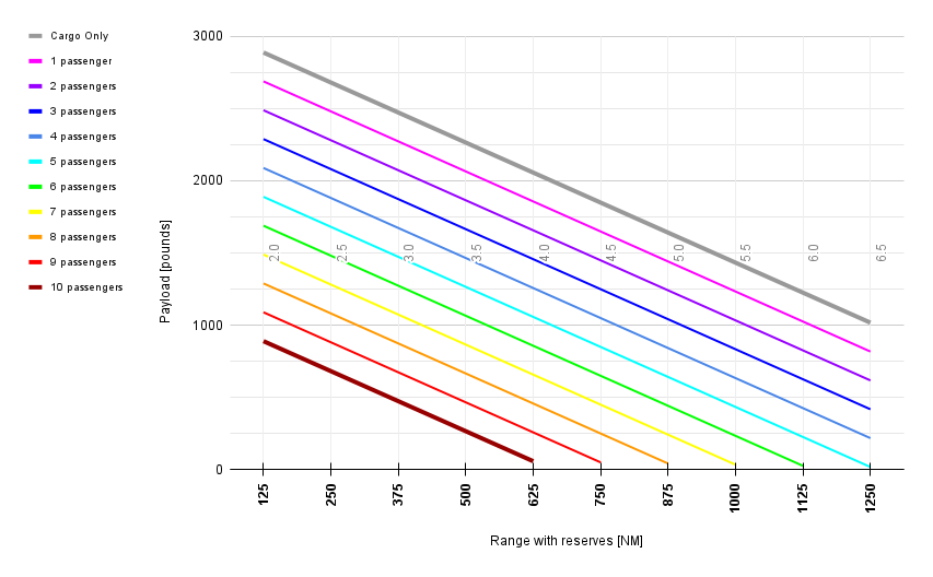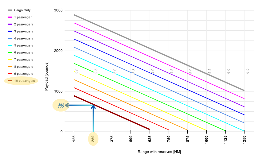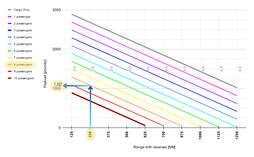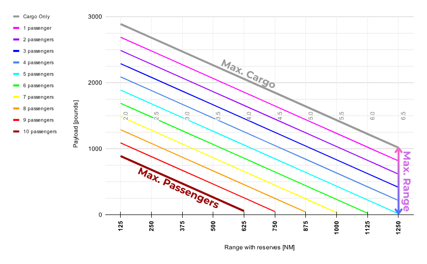 PC-12 Payload Chart including the Range [NM] with fuel reserves