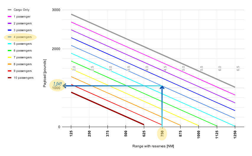 For the last example, imagine 4 executives on a 3.5-hour one-way trip with fuel available at the destination (like San Francisco, California, 700 NM away), and a 1-hour reserve (4.5 hours endurance), the payload can be: