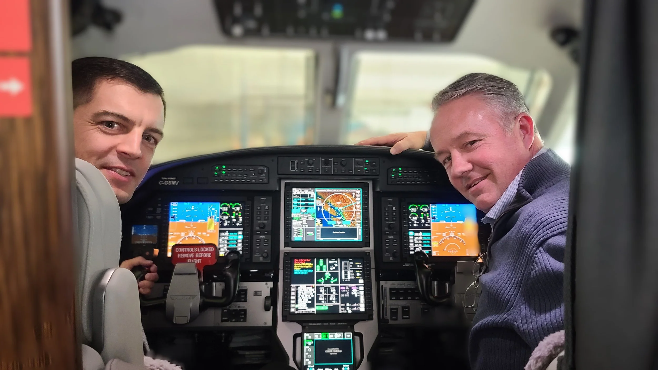 Geoff Bowering, Integrity Flight Support and Mark Cossement, AeroShares in a PC-12 NGX at a CBAA Chapter Meeting in April 2023.