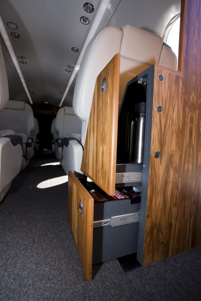 In the Executive configurations, a lavatory and cabinets with snacks, drinks and coffee are included.